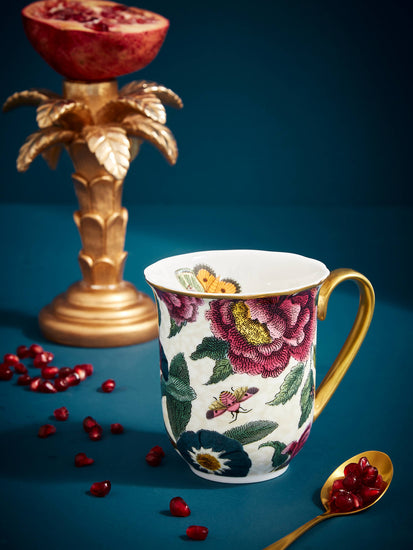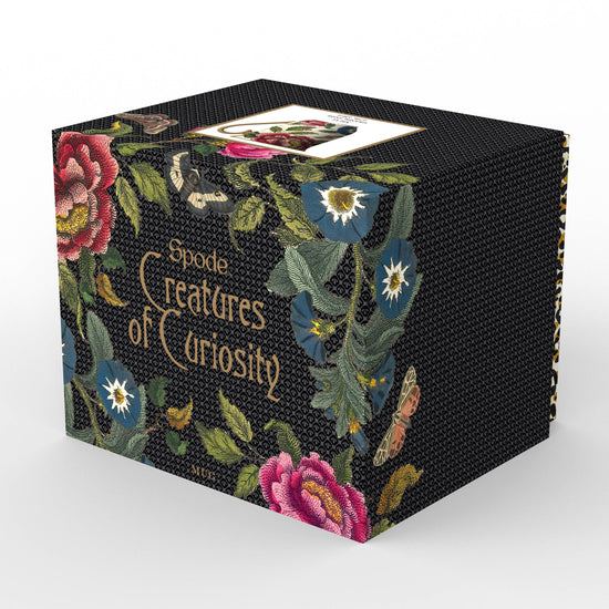 Dive into a world of dark romance and intricate detail with the Spode Creatures of Curiosity Mug in a striking black cream palette. This 12 oz mug showcases a captivating design of lush florals, exotic insects, and subtle gold accents, bringing a touch of modern gothic elegance to your daily rituals. Crafted from fine porcelain, it's perfect for coffee, tea, or any favorite beverage, inviting a sense of unique artistry into your home.