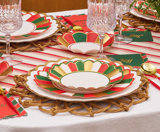 These scalloped-edge salad plates from our Joyful Christmas collection feature alternating borders of red, green, and gold with a clean, solid white center. With their bold holiday colors and elegant foil accents, they’re perfect for bringing festive cheer and sophistication to your Christmas celebrations.